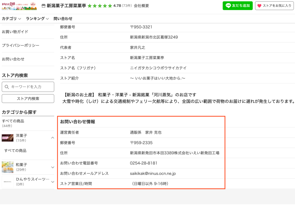 ECサイトに遷移したら、「特定商取引法にもとづく表記」というものを探し、そのページに遷移します。