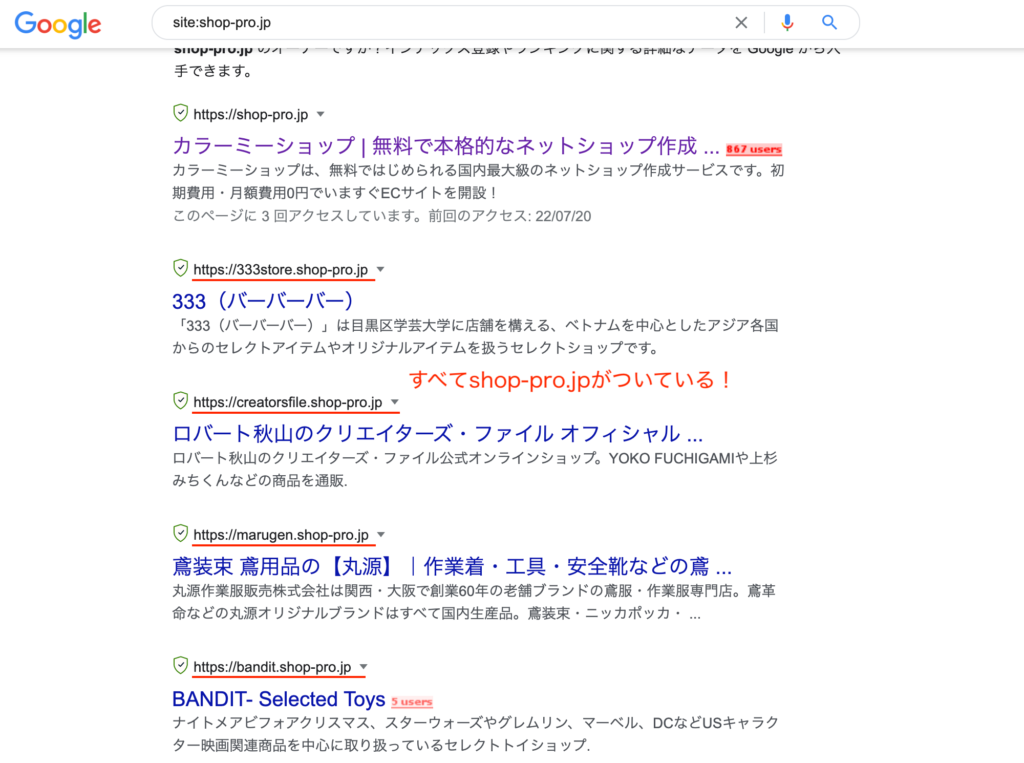 まずは、Googleで「site:shop-pro.jp」という検索ワードで検索します。